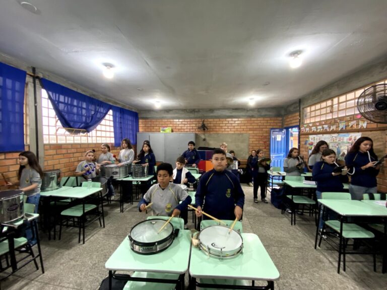 Pelo menos três vezes por semana, alunos da Escola Municipal de Ensino Fundamental (EMEF) Dom Pedro II participam do ensaio da Banda Municipal de Alvorada, um projeto que une música, disciplina e sonhos. Criada em 28 de março deste ano pela Prefeitura, por meio da Secretaria de Educação (SMED), a banda faz parte do Programa de Bandas Escolares, que tem como objetivo promover o desenvolvimento integral dos estudantes por meio da arte. Os ensaios acontecem três vezes por semana – às quartas-feiras, das 16h às 19h, e às segundas e sextas, das 17h40 às 19h40. Além da formação musical, o projeto estimula o comprometimento com os estudos e a convivência escolar. Para participar, os alunos devem estar matriculados e ter boa frequência e desempenho escolar. “Criamos esse projeto justamente para desenvolver valores e habilidades por meio da música. Acreditamos que ela tem o poder de transformar vidas e também a educação em nossa cidade”, afirma o secretário de Educação, Italo Mainieri, idealizador da iniciativa. Ao todo, são 24 instrumentistas e uma comissão de frente com porta-bandeiras, balizas, porta-estandarte e uma aluna no papel de Mor – responsável por liderar o grupo. Essa responsabilidade é de Maria Eduarda Gonçalves, que fala com orgulho sobre o papel que assumiu. “Ela diminui as chances de nós queremos abandonar os estudos, ela diminui a chance de termos doenças que causem risco à nossa saúde mental e saúde física”. Outro participante é João Henrique Lazzaretti, de 8 anos, que, em apenas um mês, disse já ter aprendido mais do que tocar caixa. “Eu ganhei mais responsabilidade na banda”. A banda também tem promovido a inclusão. Nathan de Oliveira Malta, que tem autismo nível 2 e 3, participa dos ensaios com o apoio da escola e da mãe, Claudia Ferreira. Ele que adora música, não deixa participar das aulas, mesmo usando um fone para abafar o barulho. Com dificuldade em português, as notas musicais são adaptadas para números. “A escola me ajuda nesse ponto. Ajuda porque ele quer, ele ama música. E também o ajuda a desenvolver mais a parte da fala”, comentou. Mais do que um espaço de aprendizado musical, o projeto representa um caminho de oportunidades, conforme o coordenador do projeto, professor José Santana. “Ele traz a futura profissionalização, tira as crianças das situações de risco e vulnerabilidades sociais, aumenta a autoestima, o sentimento de pertencimento e a união delas por estarem no ambiente escolar, com toda a segurança”. Um dos diferenciais do projeto é que a maioria dos alunos aprende os instrumentos do zero, com aulas práticas e acompanhamento constante. Até o final de agosto, o programa deve receber novos instrumentos, sendo principalmente os de sopros, entre eles, trompetes, trombones, saxofones e bombardinos, e ser ampliado para as escolas Duque de Caxias e Gentil Machado de Godoy. Texto: Nathália Ely