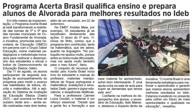 A alfabetização nas escolas municipais de Alvorada está avançando em ritmo acelerado. O Pacto pela Alfabetização, programa executado pela Prefeitura por meio da Secretaria de Educação (SMED), em parceria com o Instituto Raiar, vem trazendo resultados expressivos em 2025. A segunda rodada de avaliações mostrou que 63% dos alunos do 2º ano do Ensino Fundamental da rede municipal atingiram nível adequado de leitura. No 1º ano, o crescimento também foi significativo: 15% de aumento no número de estudantes leitores em comparação ao início do ano letivo. Com esses resultados, Alvorada se aproxima da média nacional dos municípios que participam do Pacto (69%). Os dados foram apresentados pela equipe da SMED para os diretores das escolas municipais nesta terça-feira (23). Para o secretário de Educação, Italo Mainieri, os números confirmam a efetividade da política educacional adotada. “O crescimento da taxa de alunos leitores reflete o investimento da gestão municipal e o esforço coletivo das escolas, professores e famílias. Nosso compromisso é oferecer uma educação de qualidade e equitativa, capaz de transformar vidas e preparar nossos alunos para o futuro”, destacou. Durante o encontro, foram reconhecidas as instituições que mais se destacaram no Pacto. A avaliação mede três competências fundamentais: leitura, compreensão de texto e escrita. A EMEF Vereador Cléo dos Santos teve os melhores resultados no 1º ano, seguido pela EMEF Emília de Oliveira. Já no 2º ano, EMEF Juliano Nascimento ficou em primeiro lugar, e EMEF Padre Leo Seidel em segundo. A diretora da EMEF Juliano Nascimento, Carla Pacheco, destacou o impacto da iniciativa e o trabalho em grupo. “A escola está tendo um olhar diferenciado para esses educadores e para os educandos. O Pacto trouxe um novo renovo, foi transformador”. Preparação para o SAEB 2025 O evento também destacou as escolas com melhores desempenhos no programa Acerta Brasil, voltado para a preparação do Sistema de Avaliação da Educação Básica (SAEB), principal referência para o cálculo do IDEB. Os destaques em Língua Portuguesa foram: No 5º ano, 1º lugar para EMEF Leonel de Moura Brizola e 2º, EMEF Monteiro Lobato. No 9º ano, um empate na primeira colocação entre EMEF Leonel de Moura Brizola e EMEF Capitão Gentil Machado de Godoy. Em Matemática, o 1º lugar foi da EMEF Monteiro Lobato e o 2º da EMEF Leonel de Moura Brizola, nas turmas de 5º ano. Já no 9º ano, a EMEF Leonel de Moura Brizola teve o melhor desempenho, seguida pela EMEF Capitão Gentil Machado de Godoy. Texto: Nathália Ely/Prefeitura de Alvorada