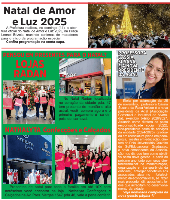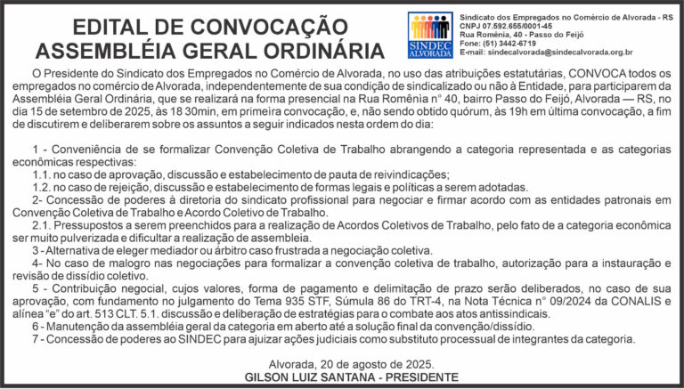 ACIAL – ASSOCIAÇÃO COMERCIAL, INDUSTRIAL E DE SERVIÇOS DE ALVORADA CNPJ: 87.433.249/0001-79 EDITAL DE CONVOCAÇÃO ASSEMBLEIA GERAL ORDINÁRIA O Presidente do Conselho Administrativo da Associação Comercial, Industrial e de Serviços de Alvorada – ACIAL, conforme lhe faculta os artigos 12, 13, 14, 15, 16, 17, 18, 25 e 45 do Estatuto Social, convoca os associados da entidade para a Assembleia Geral Ordinária, a ser realizada no dia 25 de novembro de 2025, na Sede Social, sita à Rua Piauí, 429, nesta cidade de Alvorada/RS, às 12h em primeira chamada e às 12h30min em segunda e última chamada, para deliberar sobre a seguinte: ORDEM DO DIA - Prestação de contas da gestão: Biênio 2024/2025 - Eleição do Conselho de Administração, Conselho Deliberativo e Conselho Fiscal para o Biênio 2026/2027 De acordo com o parágrafo 7ºe Art. 45 do Estatuto, a Associação Comercial, Industrial e de Serviços de Alvorada – ACIAL convoca sua comunidade de associados para participar da Assembleia Geral de Eleição da Nova Presidência, que ocorrerá no dia 25 de novembro de 2025. Fica aberto dodia1 ao dia 30 de outubro de 2025 o prazo para apresentação de chapas interessadas em concorrer ao pleito. José Edson Robalo Baxinski Presidente do Conselho Administrativo