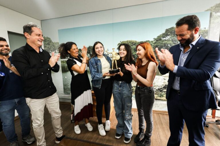 As alunas vencedoras da 10ª edição do Festival Internacional Estudantil de Cinema de Barra do Piraí (RJ) – realizado em outubro deste ano – foram recebidas pelo prefeito Douglas Martello nesta terça-feira (09). No encontro, as estudantes do Centro de Educação Adelino Ferreira Borba receberam a premiação do criador do festival, Roberto Monzo, que veio especialmente a Alvorada para reconhecer o trabalho da equipe. O prefeito celebrou a conquista ao lado da equipe escolar e de representantes do evento: “É um orgulho enorme ver nossos alunos levando o nome de Alvorada para o Brasil e para o mundo. Essa conquista mostra o poder da educação, do cinema estudantil e da criatividade dos nossos jovens”. O curta-metragem “De Repente 15”, dirigido por Letícia Pacheco, com direção de arte de Vitória Corrêa e atuação de Júlia Freitas, conquistou o prêmio de Melhor Filme na Mostra Competitiva Nacional. O secretário de Educação, Italo Mainieri, ressaltou a importância da conquista: “Essa vitória não é apenas um prêmio, é um símbolo do que estamos construindo: uma educação que estimula a arte, o pensamento crítico e o protagonismo dos alunos”. Roberto parabenizou o trabalho da Prefeitura, apoiando o cinema escolar. “Trazemos, especialmente, o prêmio Oscar Estudantil Brasileiro, o Troféu Dom Quixote, para a cidade de Alvorada. E nos colocamos à disposição para as cidades trabalharem o audiovisual como uma vocação, uma identidade da cidade”. Para Julia, a conquista é muito gratificante. “É muito importante ganharmos esse prêmio pelo esforço que fizemos, pelo que tivemos que correr atrás, para conseguir fazer isso e ter essa volta com o nosso trabalho”. Também participaram da recepção o diretor do Centro, Guilherme Guterres, o professor de Audiovisual, Adailton Moreira, a professora de Teatro, Vânia Tavares, e o coordenador do Festival de Cinema Escolar de Alvorada (FECEA), André Bozzetti. Texto: Nathália Ely/Prefeitura de Alvorada