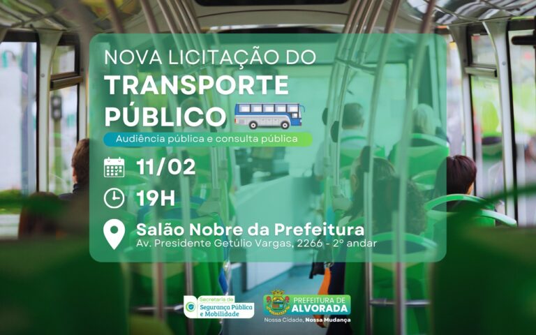 A Prefeitura de Alvorada através da Secretaria de Segurança Pública e Mobilidade Urbana realizará uma Audiência Pública e Consulta Pública para tratar da futura concessão do serviço de transporte público do município. O encontro tem como objetivo promover a transparência do processo e garantir a participação da comunidade nas decisões que impactam diretamente a mobilidade urbana da cidade. O evento será realizado no dia 11 de fevereiro, às 19h, no Salão Nobre da Prefeitura Municipal de Alvorada, e é aberto à participação de todos os alvoradenses. De acordo com o secretário de Segurança Pública e Mobilidade Urbana, Rodrigo Fagundes, ouvir a comunidade é fundamental neste momento. “A Audiência Pública é uma oportunidade para ouvir a população e construir, de forma transparente e participativa, um modelo de concessão que atenda às reais necessidades dos usuários do transporte coletivo municipal”, explicou. A iniciativa também reforça a importância do envolvimento dos moradores no processo decisório. Para o secretário adjunto de Segurança Pública, comissário Zottis, a participação da comunidade contribui para decisões mais eficazes. “Esse é um espaço, onde os moradores podem se manifestar apresentar sugestões e colaborar diretamente na construção de um transporte público mais eficiente e seguro para todos”, afirmou. A Prefeitura reforça o convite para que moradores, usuários do transporte coletivo e demais interessados participem do encontro e contribuam com o futuro do transporte público no município.
